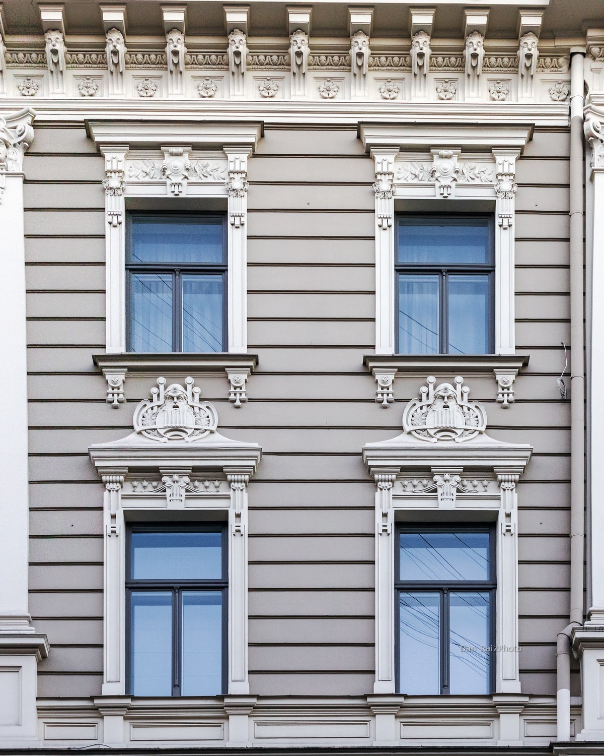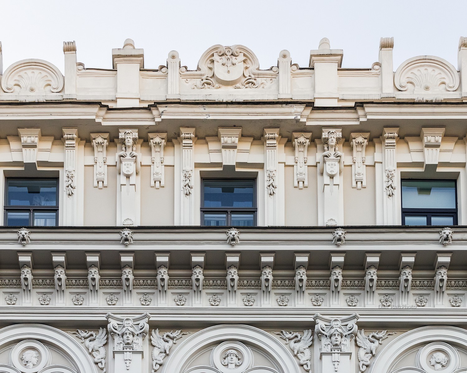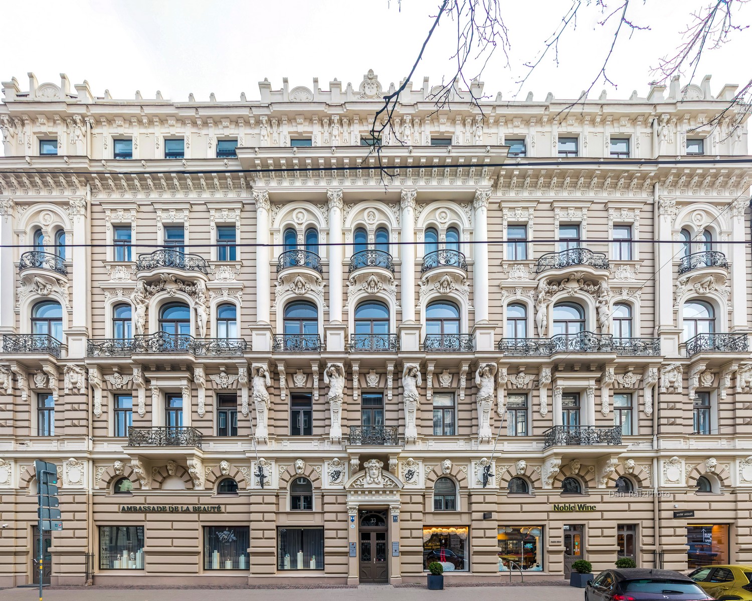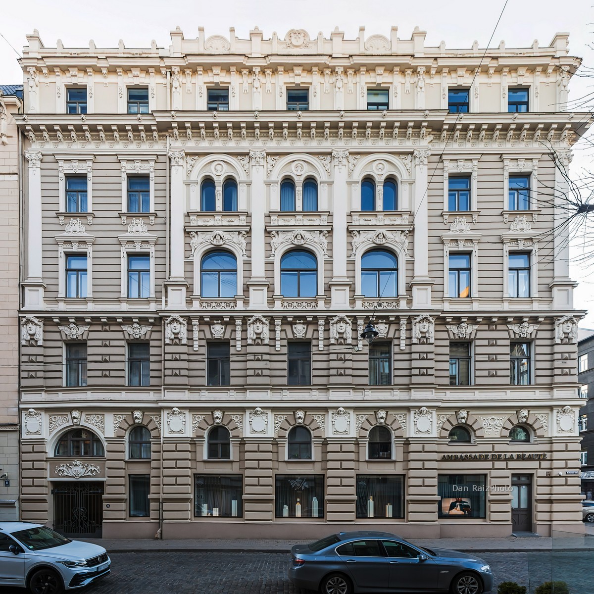 Unlike the “Blue Wonder” just down the street (No. 10b), Elizabetes 33 relies on the play of light and shadow on its white and cream-colored reliefs. For a photographer, this is actually a benefit: the monochromatic palette allows you to focus purely on the intricate textures and the “movement” of the stone.