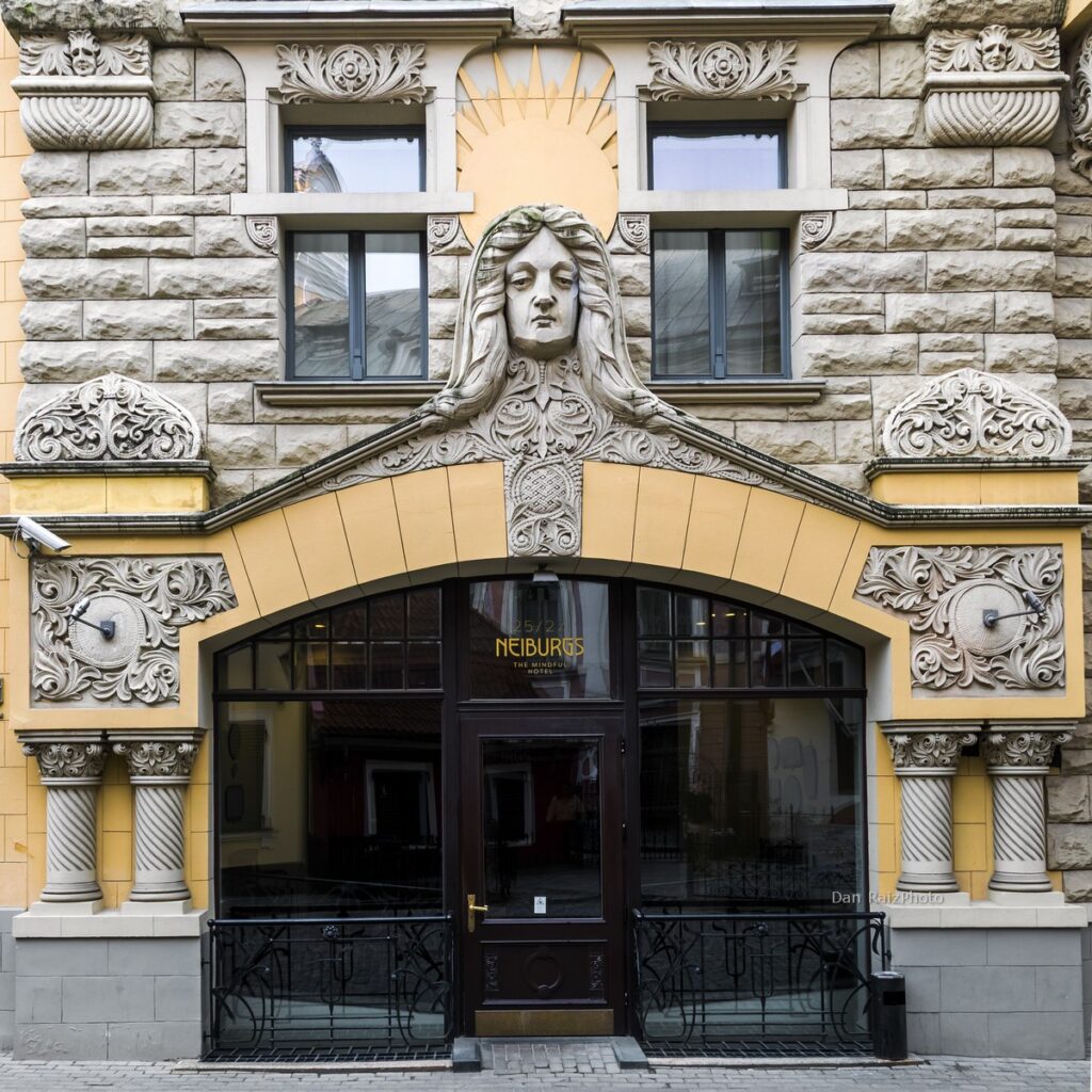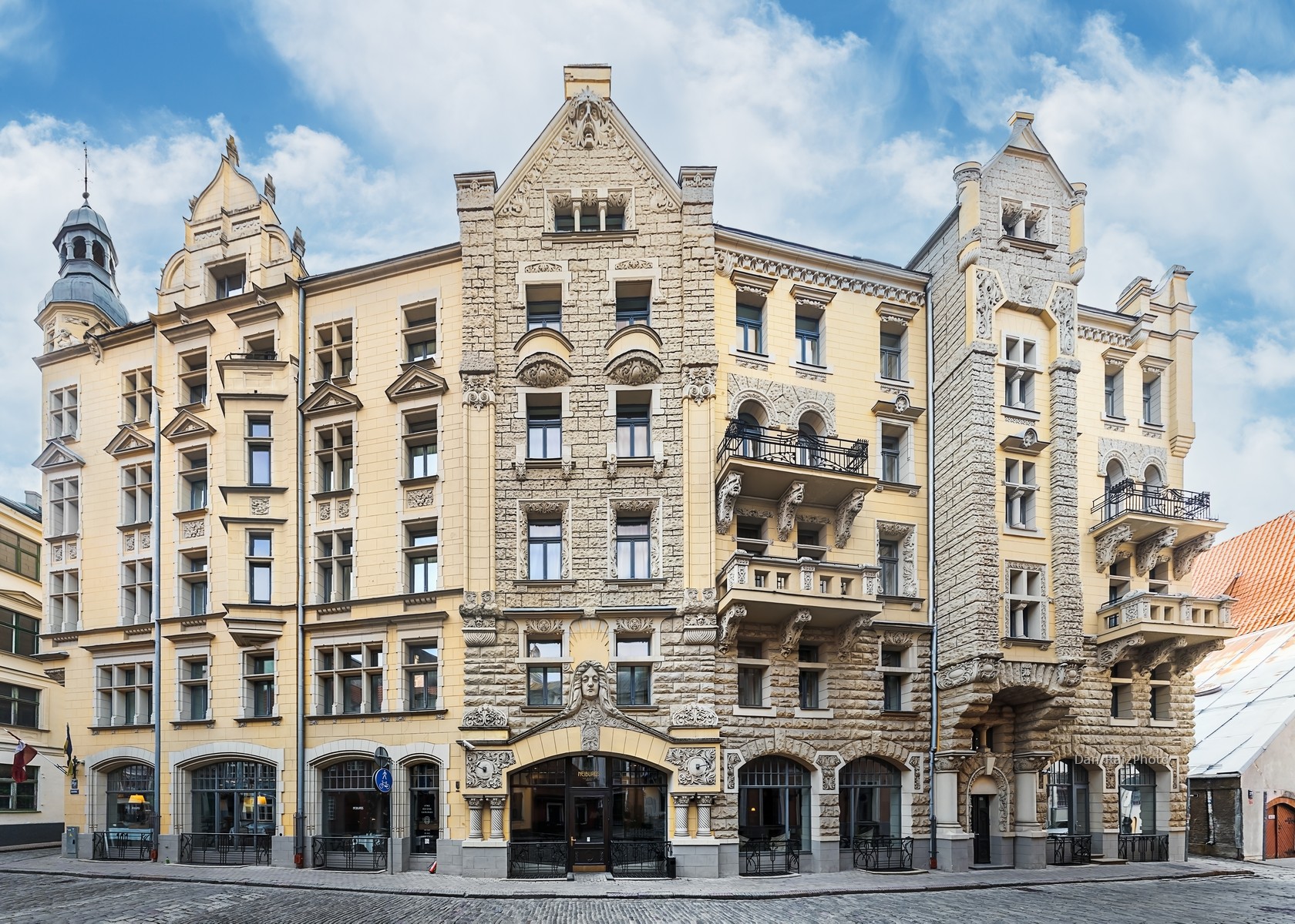 Jauniela street is perhaps the most famous corner of Old Riga, and house 25/27 is its architectural anchor. Built in 1903 by the renowned architect Wilhelm Bockslaff, this building is a masterful blend of Art Nouveau and Gothic Revival styles. Its facade, with its pointed gables and intricate stone carvings, looks like it was pulled straight from a fairy tale